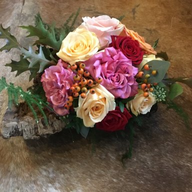 Een mooie waaier aan rozen verwerkt in de schors.