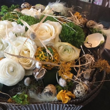 Afwerking naar eigen smaak met kwarteleitjes, mos, stro en pluimpjes.