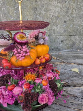 Een prachtige herfstkrans en leuke pompoentjes afgewerkt met vruchten en gedroogde bloemen.